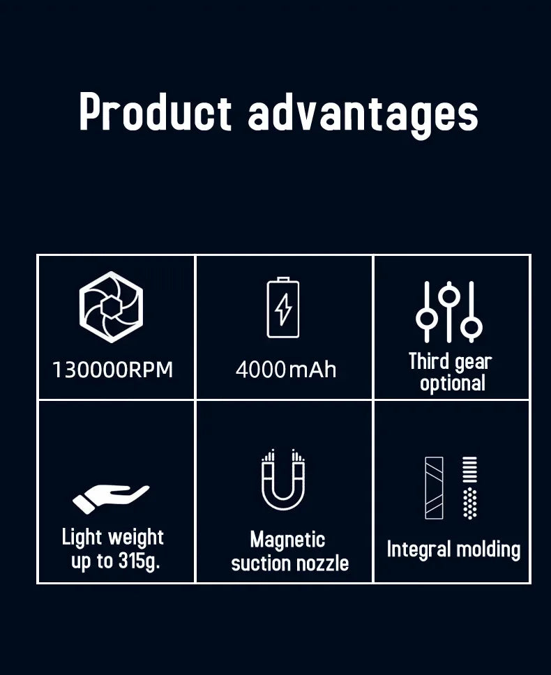 Note: The genuine AONEZ upgraded powerful vortex fan is equipped with a brushless DC high-speed motor, with a maximum output speed of 130,000 RPM, capable of generating an extremely high wind speed of up to 52 meters per second, equivalent to a typhoon of level 16. It has strong power, is long-lasting and stable, and does not burn out the machine even under long-term load. It also features charging protection and overheat protection functions, with an extremely long battery life. It is equipped with a built-in battery with a capacity of 4000mAh, making it more durable!